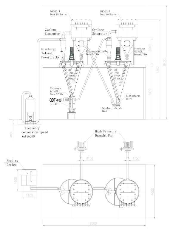 First,Raw material feed from the feeder --the material transfer to the first 3 m3mixer for premixing, and dust collector will collect dust during the feeding process, then the second 3m3 mixer store mixed material,then enter into jet mill for milling, the output particle size can be adjusted by adjusting different rotating speed of the classifier wheel,. After milling, material will transfer to the cyclone through centripetal force of draft fan and dust collector on the top of the first 4m3 mixer, then transfer to the second 4m3 mixer for mixing before package or transfer to WDG system.